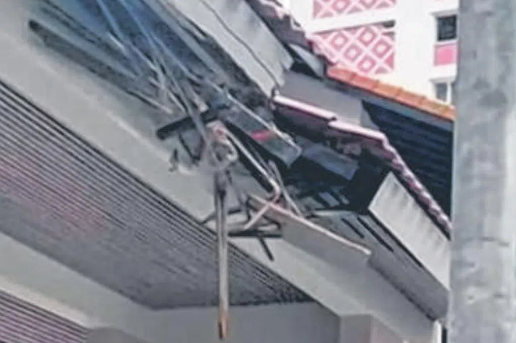 读者王先生(64岁)告诉记者,事发时在家里听到一声巨响,赶下来查看,发现一辆回收卡车的顶盖疑似撞到有盖走道屋顶,卡在路上动弹不得。
