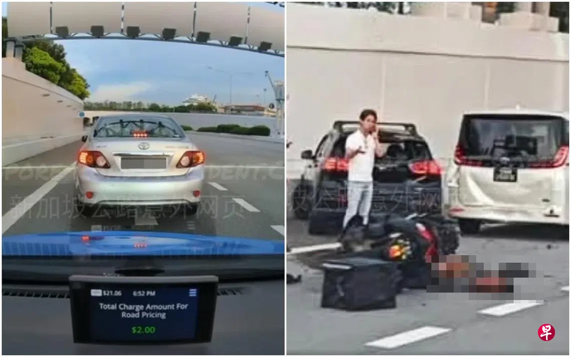 根据社交媒体流传的画面,行驶在最左侧车道的一辆丰田卡罗拉Altis,突然在一道公路电子收费(ERP)闸门前停下,导致后方车辆来不及刹车,进而发生连环车祸。画面可见,其中一辆黑色起亚汽车的引擎盖和后备箱被撞凹,安全气囊弹出;一名电单车骑士则倒卧路上,伤势不轻。