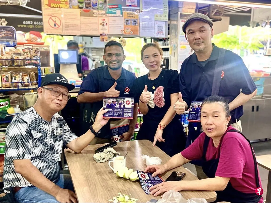 红点同心党星期六(4月5日)走访武吉巴督的咖啡店和商店,约30名党员向居民分发传单。