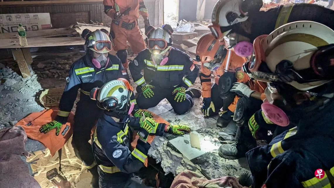 驰援缅甸的新加坡民防部队“狮心行动”队伍发现一具受困遗体,最后与他国救援队合力将罹难者移出。