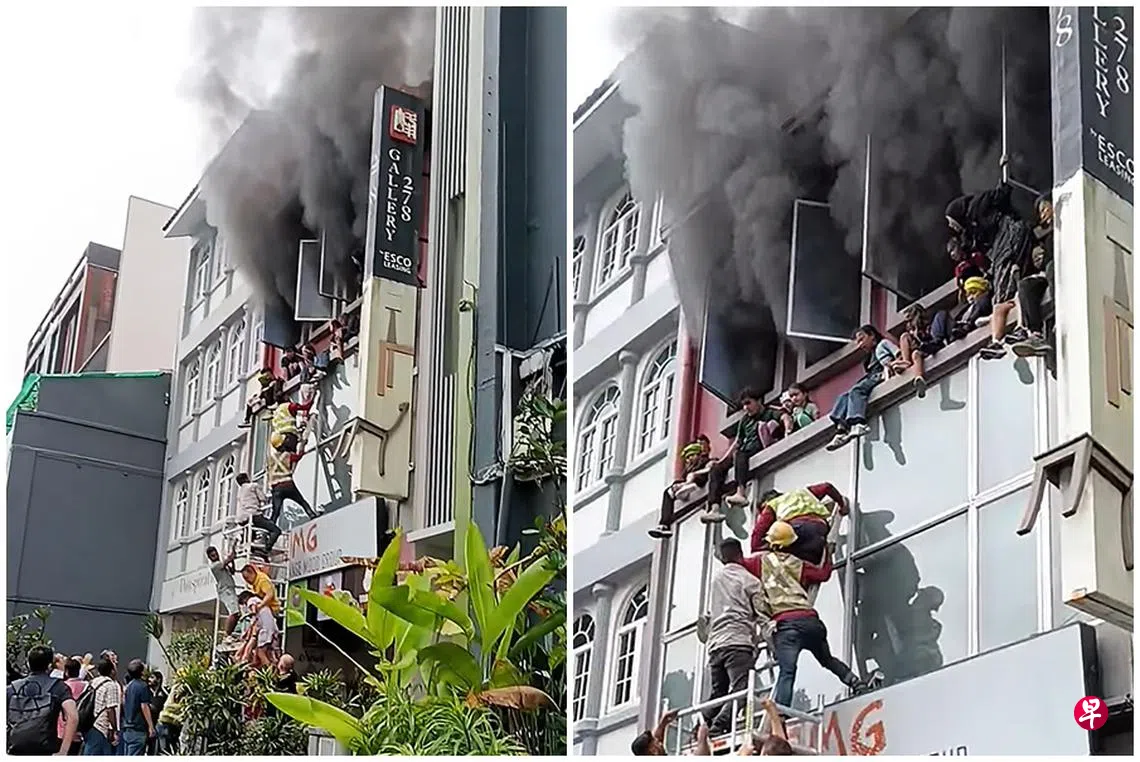 里峇峇利路一家三层楼的烹饪学校,星期二(4月8日)早上失火,三楼冒出滚滚浓烟,赶到场的客工搬来鹰架平台,和新加坡民防部队消防员塔起楼梯,将多名受困在窗台上的孩童从三楼救下。