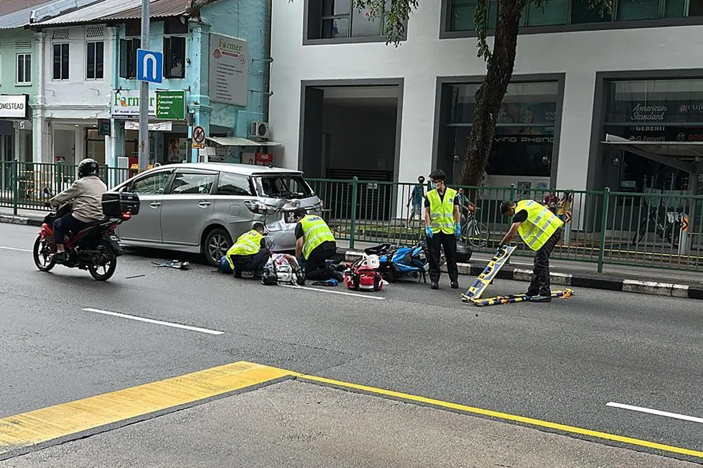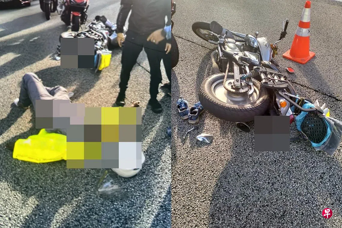 根据读者提供的照片,电单车骑士身穿荧黄色外套,倒在地上不省人事,他的白色头盔则落在一旁。伤者身边有不少人上前查看。