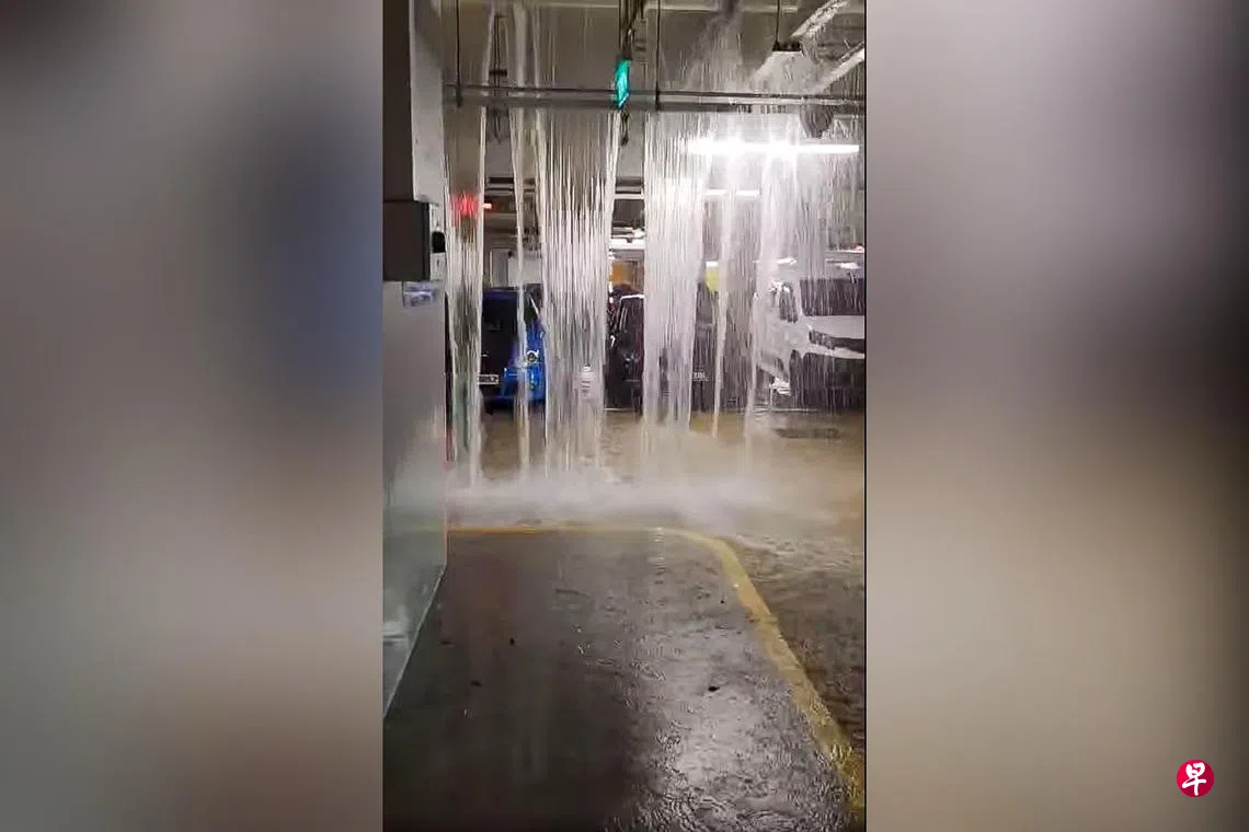 午后的雷阵雨导致榜鹅大道发生突发性淹水,一组屋地下停车场惊现“水帘洞”。