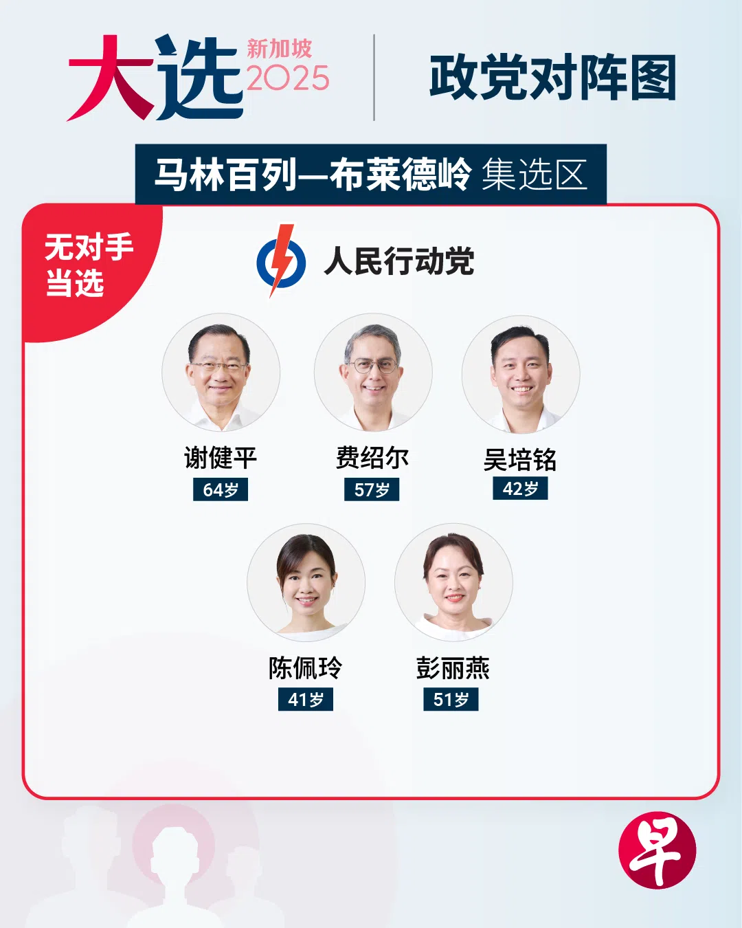 人民行动党马林百列—布莱德岭集选区五人团队无对手自动当选议员。