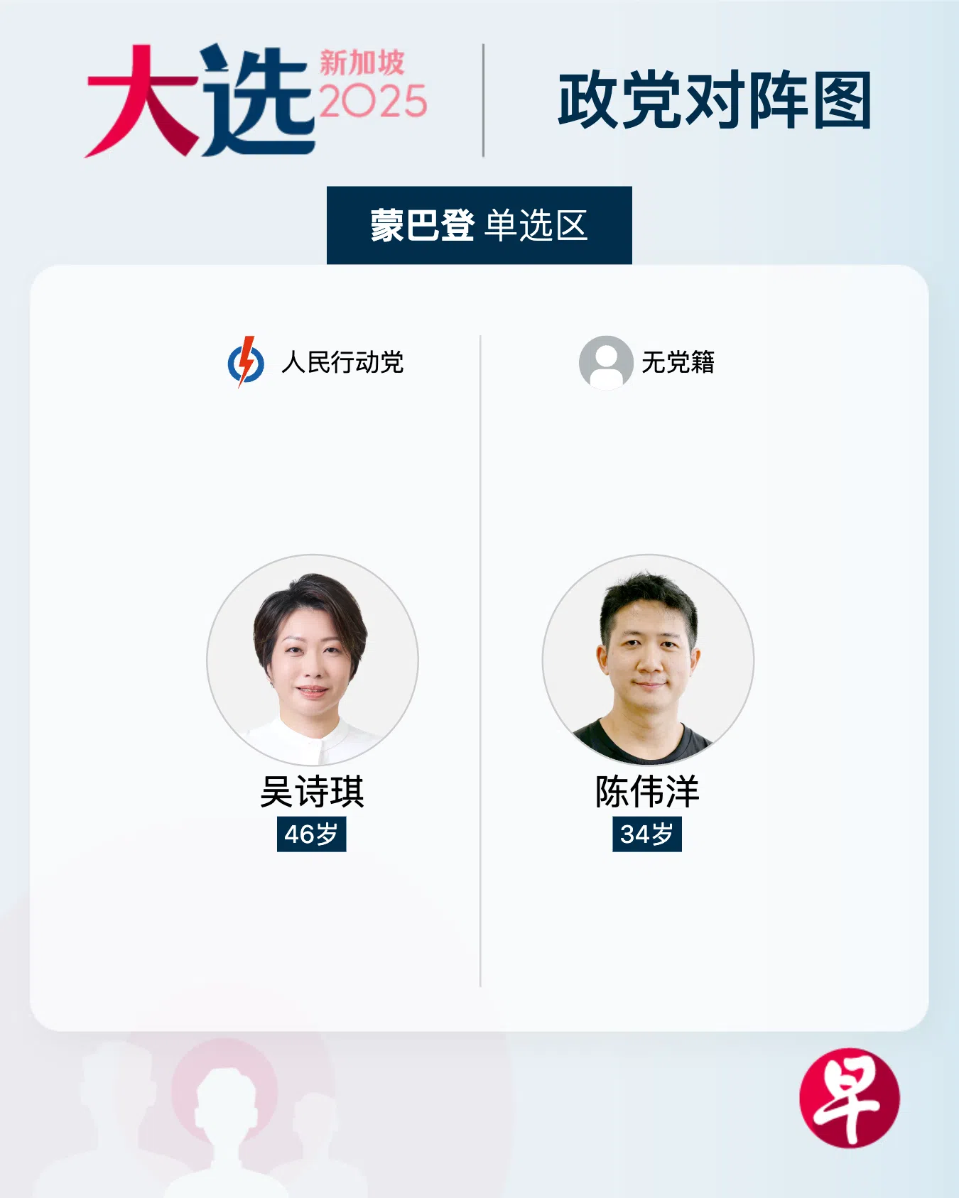 蒙巴登区选战对决敲定,人民行动党候选人吴诗琪对阵无党籍人士陈伟洋。早前宣布要竞逐这一单选区的人民联盟没有派人参选。