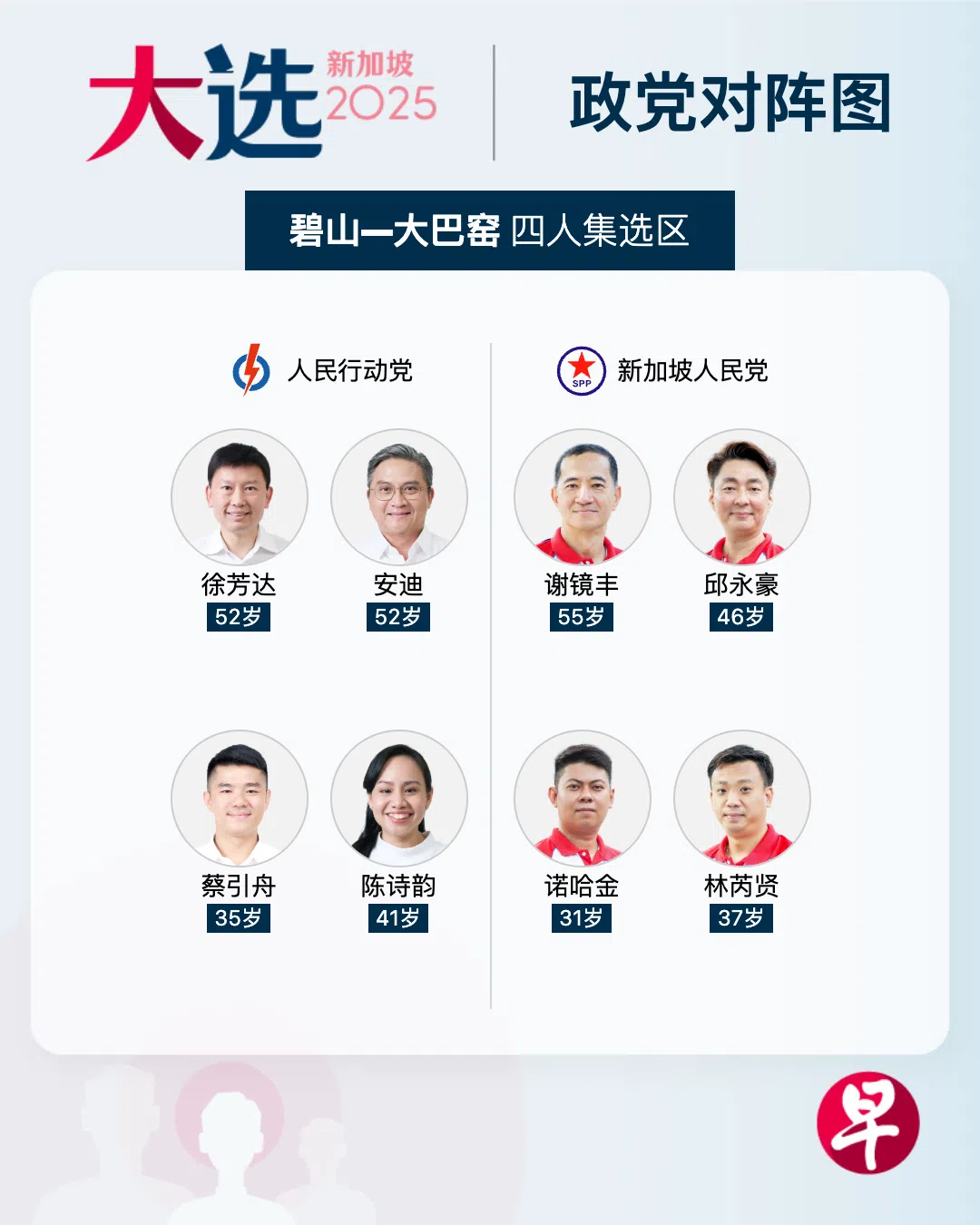 交通部长徐芳达首次领军人民行动党团队,镇守碧山—大巴窑集选区,对垒第四度挑战该区的新加坡人民党团队。