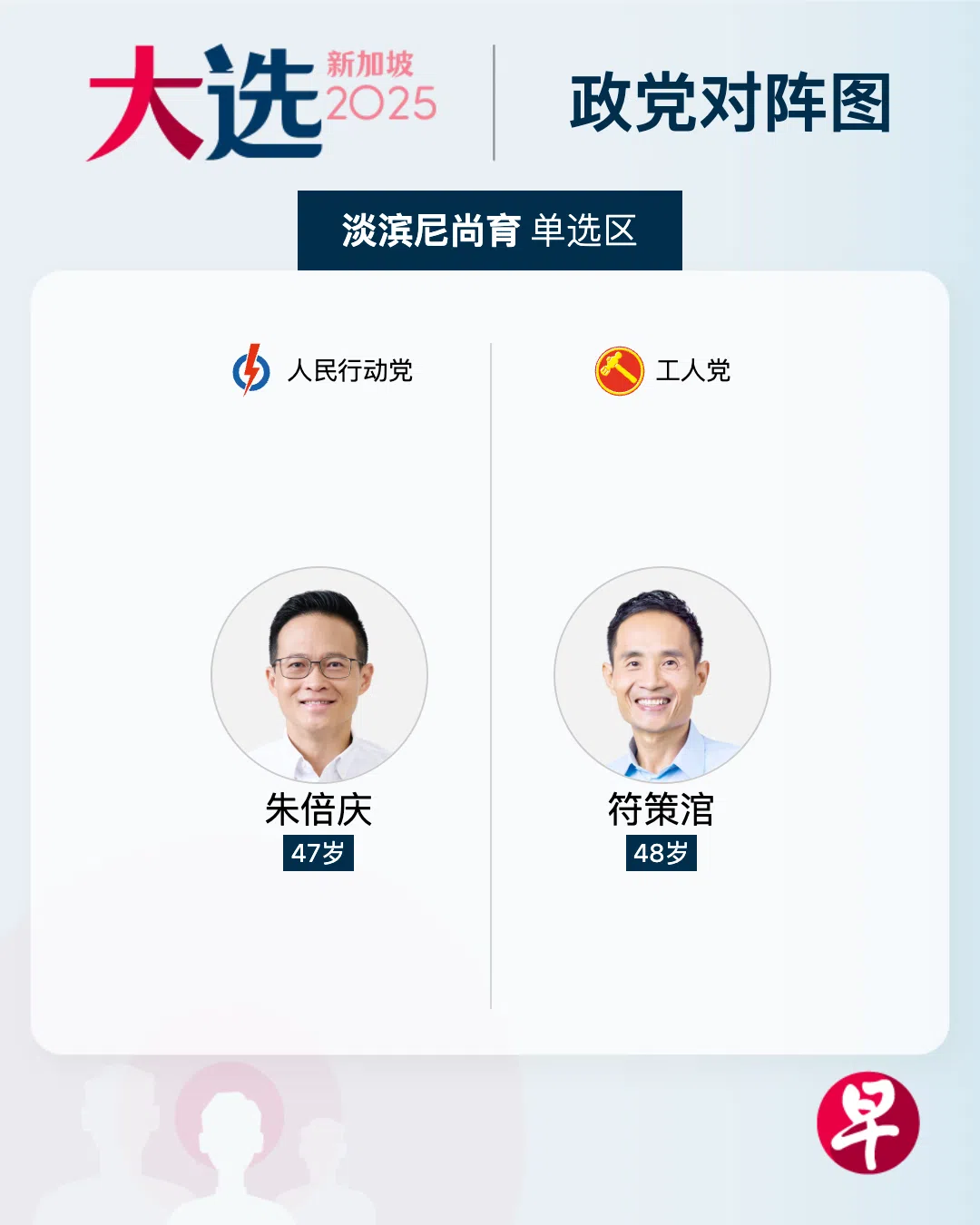 至于同一个提名中心的淡滨尼尚育区,则是行动党对垒工人党。代表行动党参选的是东北区市长朱倍庆(47岁),工人党则是曾参选的符策涫(48岁)。
