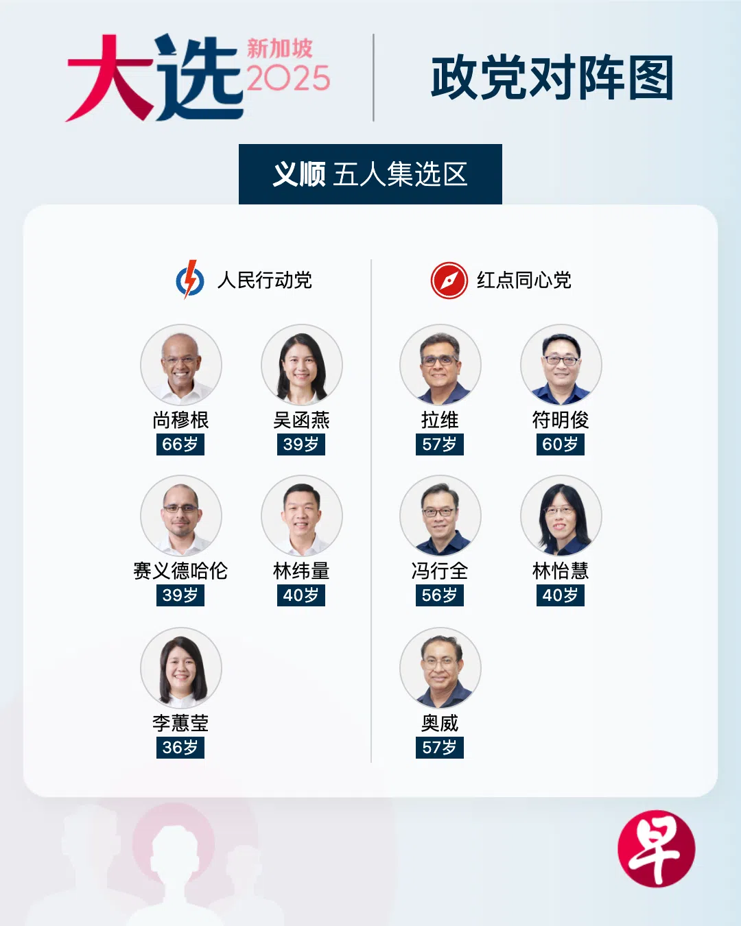 负责崇福学校提名站的选举官星期三(4月23日)下午1时许宣布提名结果。行动党的候选人分别是尚穆根(66岁)、精神科医生赛义德哈伦(Syed Harun Alhabsyi,40岁)、前公务员吴函燕(Goh Hanyan,39岁)、清洁服务和害虫防治公司主管林纬量(Jackson Lam,40岁),以及淡马锡基金会通讯总监李蕙莹(Lee Hui Ying,35岁)。