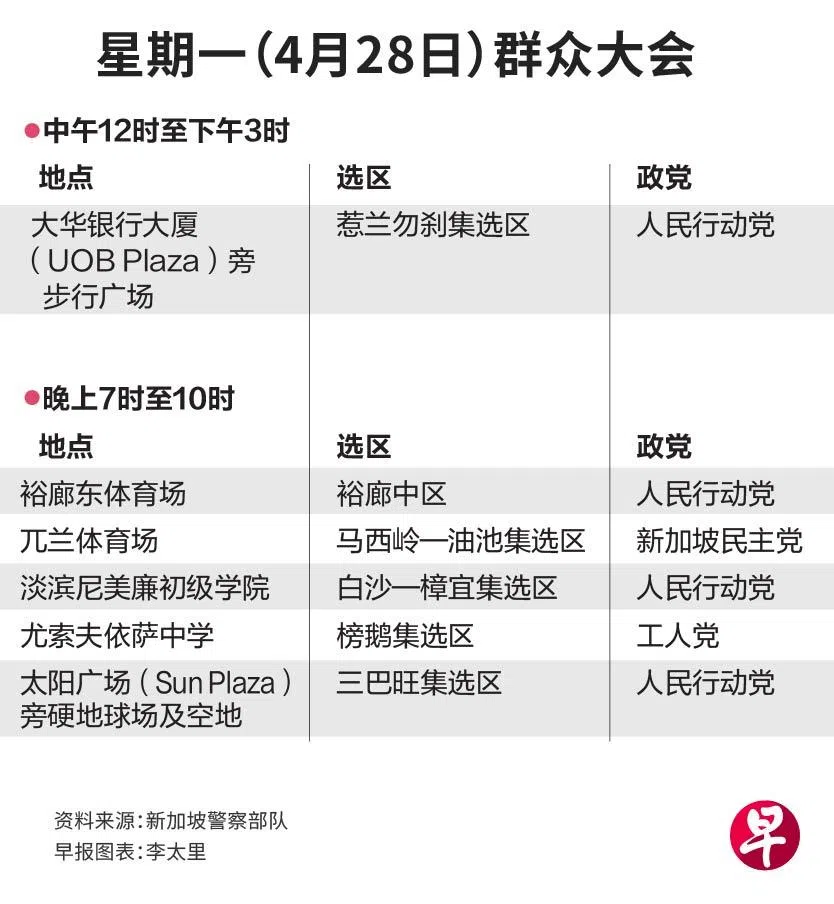 新加坡警察部队星期天(27日)在脸书发文,公布获准在星期一举行的群众大会详情。其中五场将于晚上7时至10时举行,另一场午间群众大会,则在中午12时至下午3时举行。