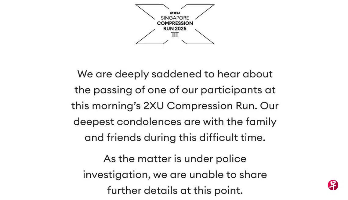 赛事主办方2XU Compression Run通过Instagram发布公告说:“我们对今早2XU Singapore Compression Run中,一位参赛者的去世深感悲痛。在这个艰难时刻,我们向其家人和朋友致以最深切的慰问。”