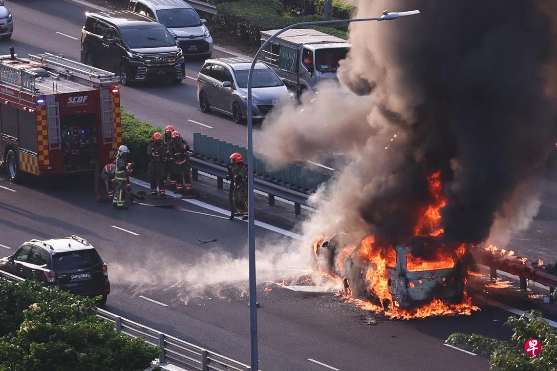 《联合早报》摄影记者途经现场时发现,一辆箱型车起火燃烧,烈焰波及路旁的栏杆。民防人员已赶到现场,正以水枪控制火势。水枪喷出的水雾与车体燃烧冒出的黑烟交织在一起,形成一片弥漫的白色蒸汽和烟雾。