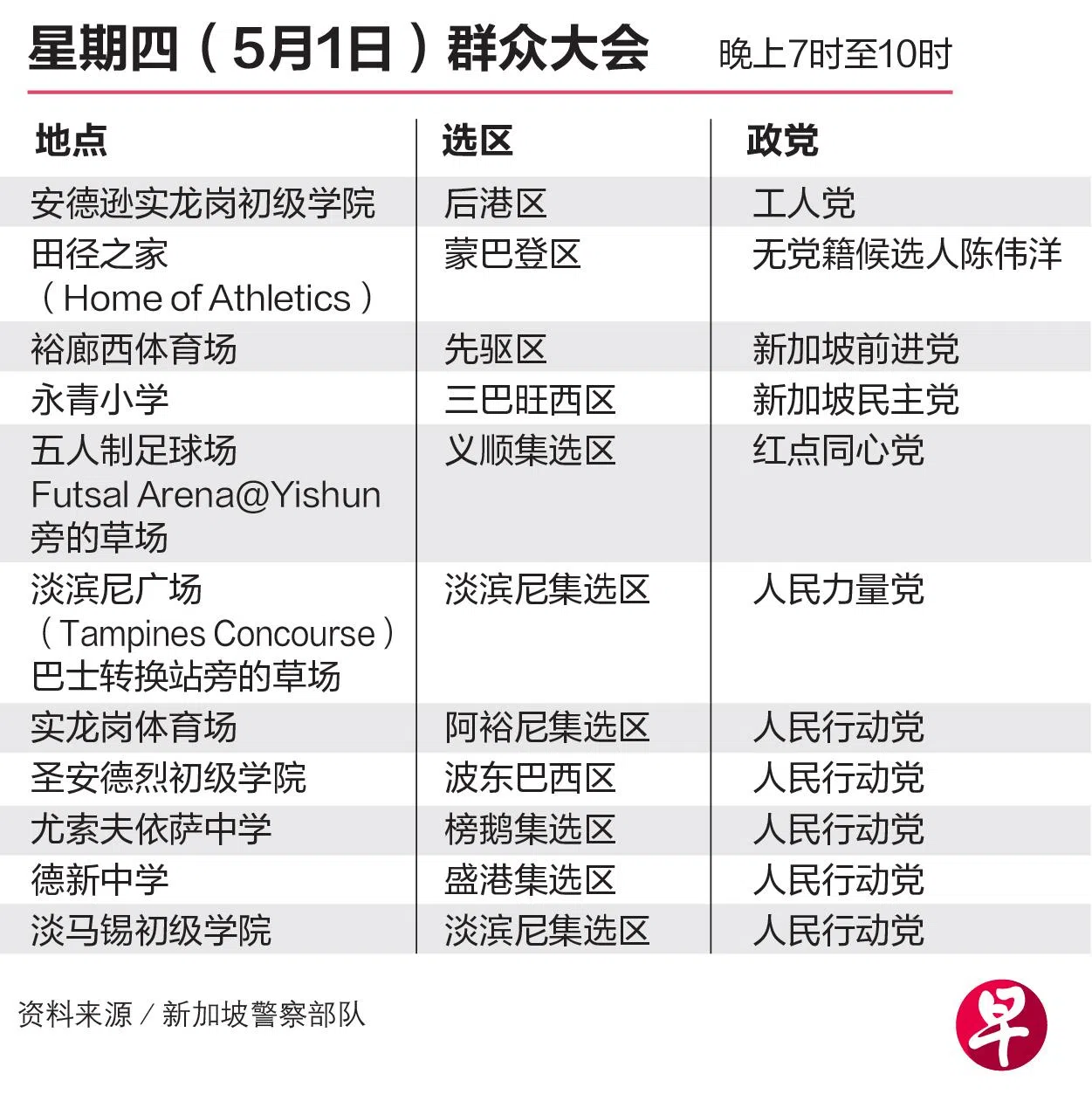 新加坡警察部队星期三(4月30日)在脸书发文,公布星期四(5月1日)、也就是投票日之前各政党最后一场群众大会详情。