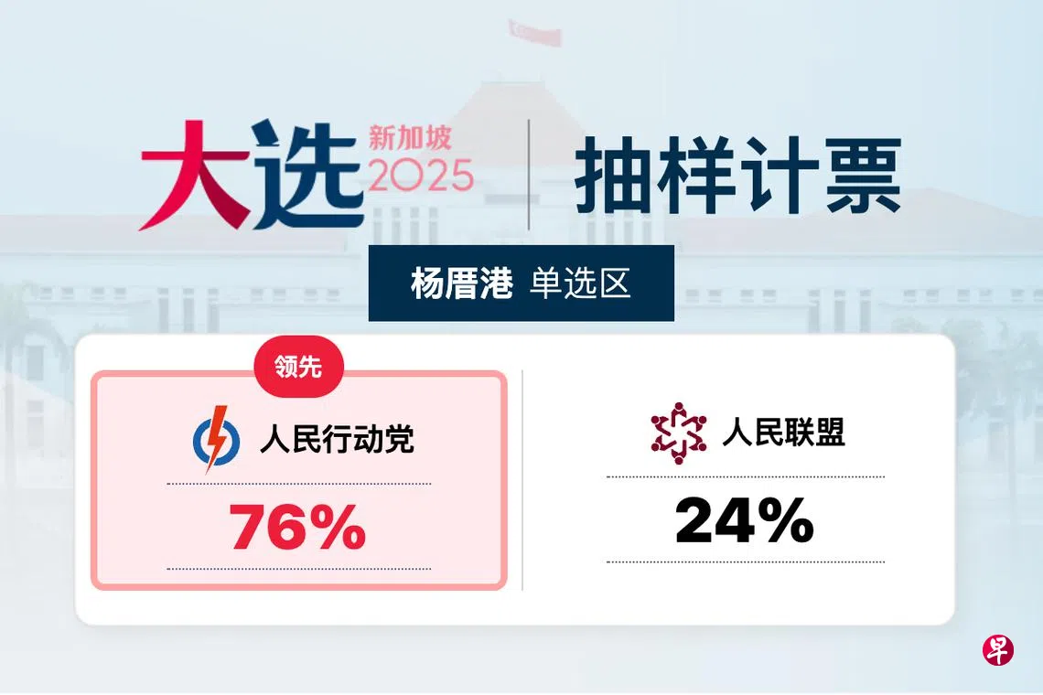 【GE2025抽样计票结果】杨厝港区 行动党领先人民行动党杨厝港区候选人叶汉荣以76%对24%,领先人民联盟的方爱民(Michael Fang)。 2025年新加坡大选投票日投票上一篇【抽样计票结果】淡滨尼尚育区 行动党领先下一篇【抽样计票结果】阿裕尼集选区 工人党领先购买此文章