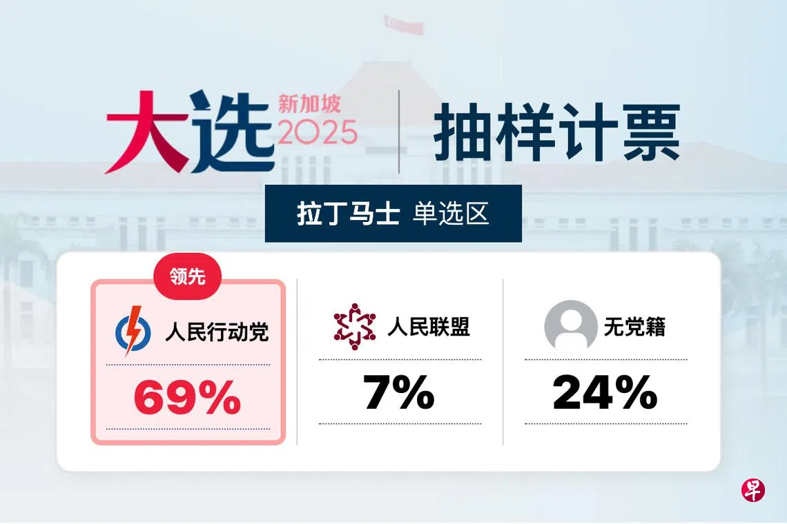 【GE2025抽样计票结果】拉丁马士区 行动党领先人民行动党拉丁马士区候选人杨益财以69%,领先无党籍的劳家强(Darryl Lo)(24%)和人民联盟的古玛(Kumar Appavoo)(7%)。 2025年新加坡大选投票日投票上一篇【抽样计票结果】阿裕尼集选区 工人党领先下一篇【抽样计票结果】玛丽蒙区 行动党领先购买此文章