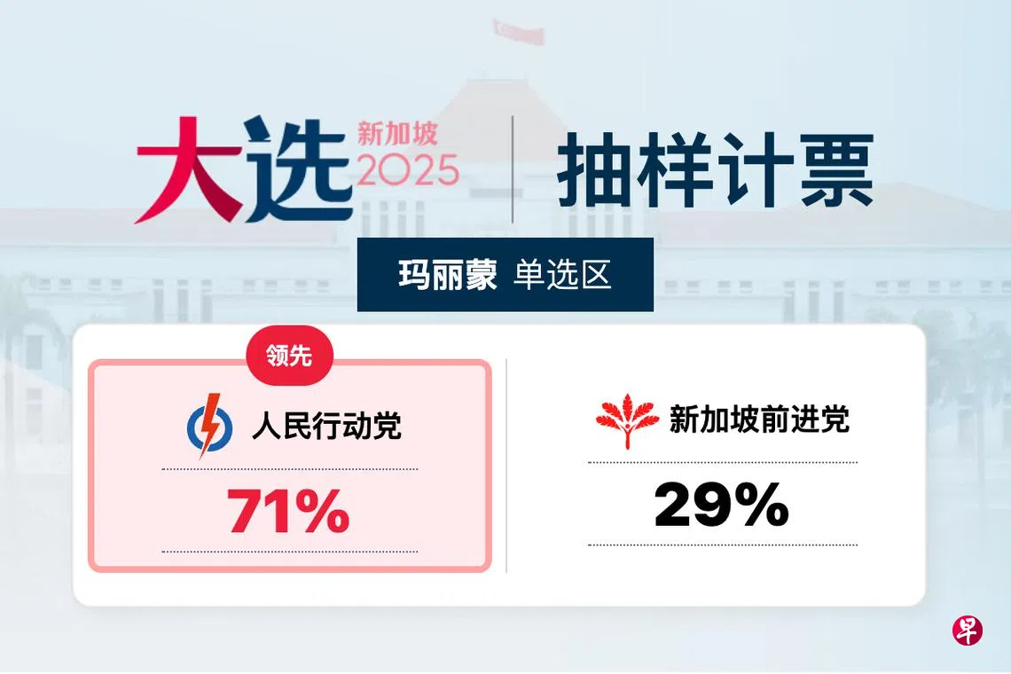 【GE2025抽样计票结果】玛丽蒙区 行动党领先人民行动党玛丽蒙区候选人颜晓芳以71%对29%,领先新加坡前进党的邱宝忠(Jeffrey Khoo)。 2025年新加坡大选投票日投票上一篇【抽样计票结果】拉丁马士区 行动党领先 下一篇【抽样计票结果】宏茂桥集选区 行动党领先购买此文章