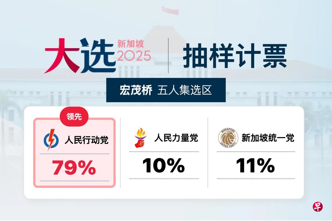 人民行动党宏茂桥集选区候选人李显龙、娜蒂雅、杰乐、赖添发和刘洁敏(Jasmin Lau),以79%领先新加坡统一党(11%)和人民力量党(10%)。