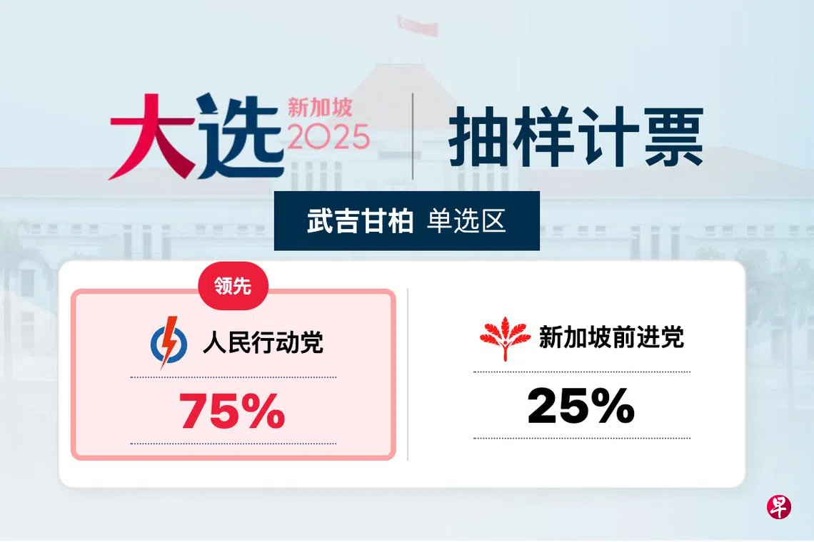 【GE2025抽样计票结果】武吉甘柏区 行动党领先人民行动党武吉甘柏区候选人刘燕玲以75%对25%,领先新加坡前进党的哈里什(Harish Pillay)。 2025年新加坡大选投票日投票上一篇【抽样计票结果】白沙—樟宜集选区 行动党领先下一篇【抽样计票结果】哥本峇鲁区 行动党领先购买此文章