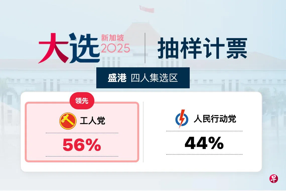 工人党盛港集选区候选人何廷儒、林志蔚、蔡庆威和穆海民(Abdul Muhaimin Abdul Malik)以56%对44%,领先人民行动党的蓝彬明、黎曦怡(Theodora Lai)、艾乐米(Elmie Nekmat)和王诗佳(Bernadette Giam)。