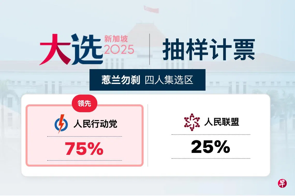 人民行动党惹兰勿刹集选区候选人杨莉明、潘丽萍、文礼佳和罗守恩(Shawn Loh),以75%对25%,领先人民联盟的赵善光(Chiu Shin Kong)、萨瑞娜(Sarina Binte Abu Hassan)、维妮(Vigneswari V Ramachandran)和莫哈末哈敏(Mohamad Hamim Bin Aliyas)。