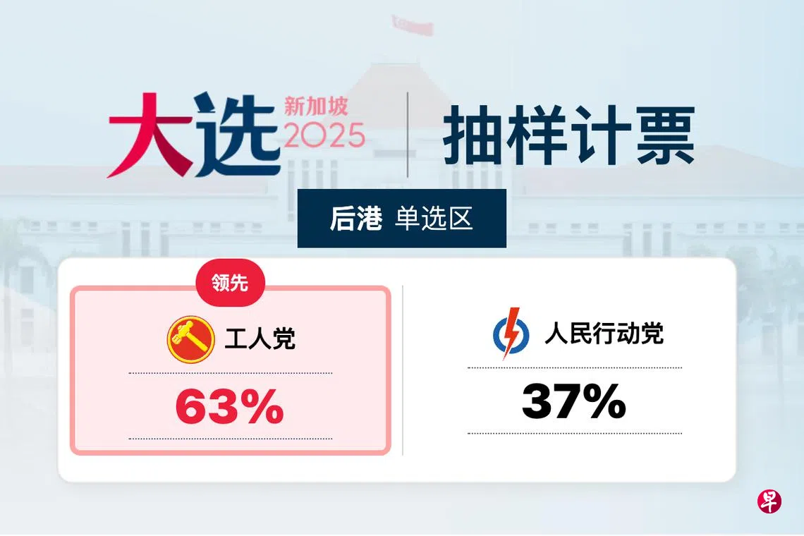【GE2025抽样计票结果】后港区 工人党领先工人党后港区候选人陈立峰以63%对37%,领先人民行动党的林于晖(Marshall Lim)。 2025年新加坡大选投票日投票上一篇【抽样计票结果】惹兰勿刹集选区 行动党领先下一篇【抽样计票结果】淡滨尼集选区 行动党领先购买此文章