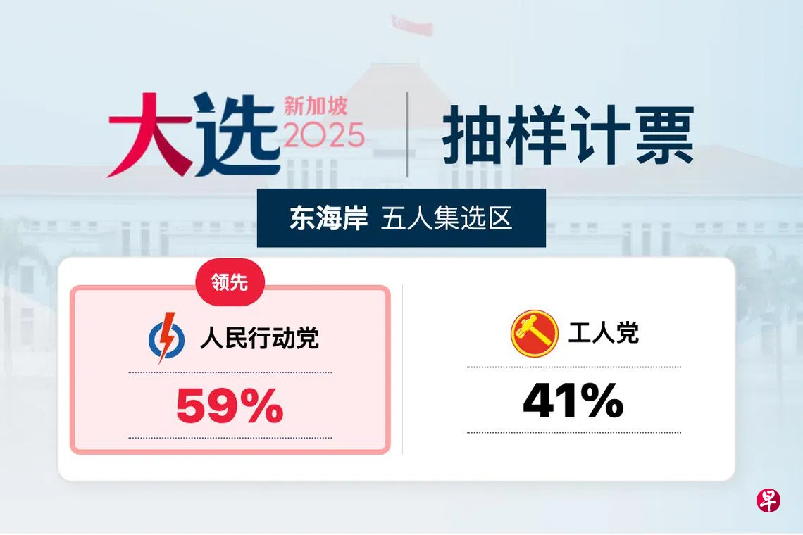 人民行动党东海岸集选区候选人唐振辉、陈杰豪、陈舜娘、迪内希(Dinesh Vasu Dash)和何礼娜(Hazlina Abdul Halim),以59%对41%,领先工人党的余振忠、许金桂、维巴黎(Paris V Parameswari)、苏菲安(Sufyan Mikhail Putra Mohd Kamil)和关汉伟。
