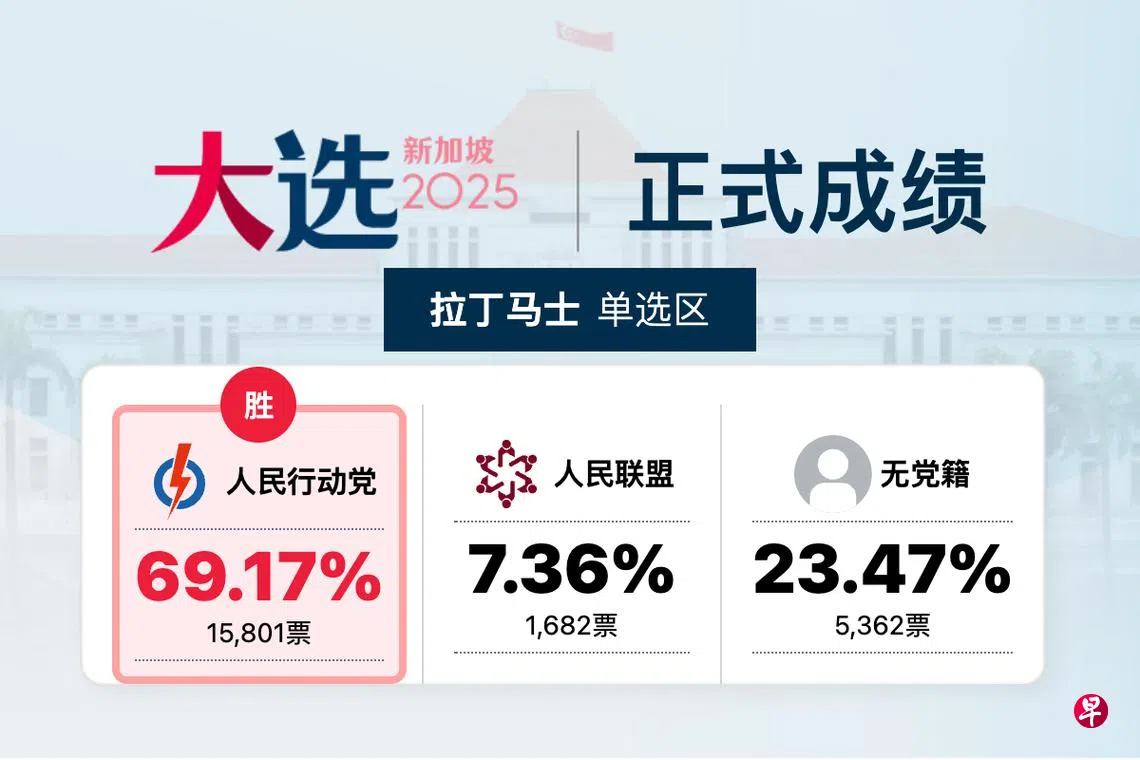 【GE2025正式成绩】拉丁马士区 行动党胜出 人民行动党拉丁马士区候选人杨益财以69.17%,击败无党籍的劳家强(Darryl Lo,23.47%)和人民联盟的古玛(Kumar Appavoo,7.36%),守土成功。人民联盟候选人古玛将失去按柜金。 2025年新加坡大选投票日投票人民行动党上一篇抽样计票显示 行动党在29个选区领先 工人党守住原有选区下一篇【正式成绩】玛丽蒙区 行动党胜出购买此文章