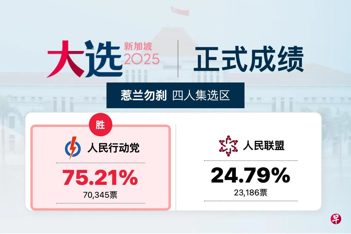 人民行动党惹兰勿刹集选区候选人杨莉明、潘丽萍、文礼佳和罗守恩(Shawn Loh),以75.21%对24.79%,击败人民联盟的赵善光(Chiu Shin Kong)、萨瑞娜(Sarina Binte Abu Hassan)、维妮(Vigneswari V Ramachandran)和莫哈末哈敏(Mohamad Hamim Bin Aliyas),成功守土。