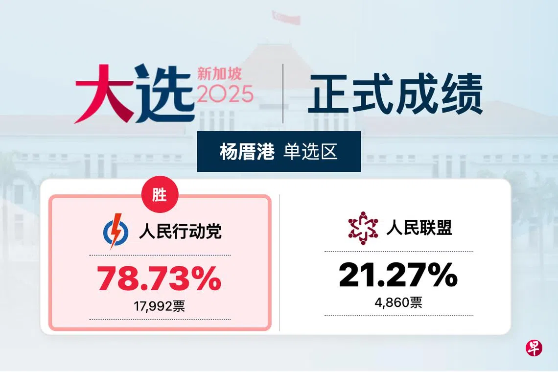 【GE2025正式成绩】杨厝港单选区 行动党胜出人民行动党杨厝港单选区候选人叶汉荣以78.73%对21.27%,击败人民联盟候选人方爱民(Michael Fang),守土成功。 2025年新加坡大选投票日投票人民行动党上一篇【正式成绩】马西岭—油池集选区 行动党胜出下一篇【正式成绩】惹兰加由区 行动党胜出购买此文章