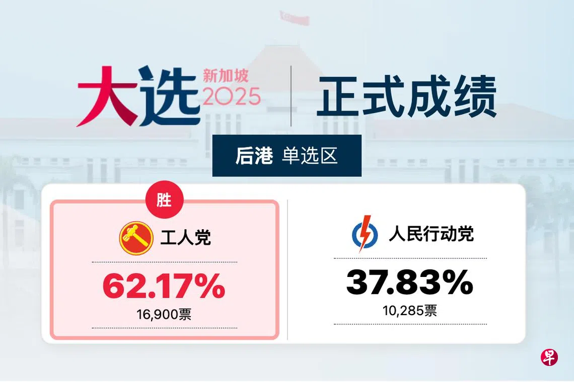【GE2025正式成绩】后港区 工人党胜出工人党后港区候选人陈立峰以62.17%对37.83%,击败人民行动党的林于晖(Marshall Lim),守土成功。 2025年新加坡大选投票日投票工人党人民行动党上一篇【正式成绩】宏茂桥集选区 行动党胜出下一篇【正式成绩】淡滨尼尚育单选区 行动党胜出购买此文章