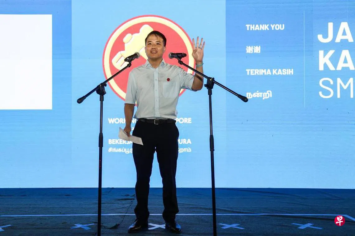 刘宇扬(Andre Low)星期日(5月4日)晚上在实龙岗体育场的工人党集合中心,与其他候选人及支持者一起等候开票结果。