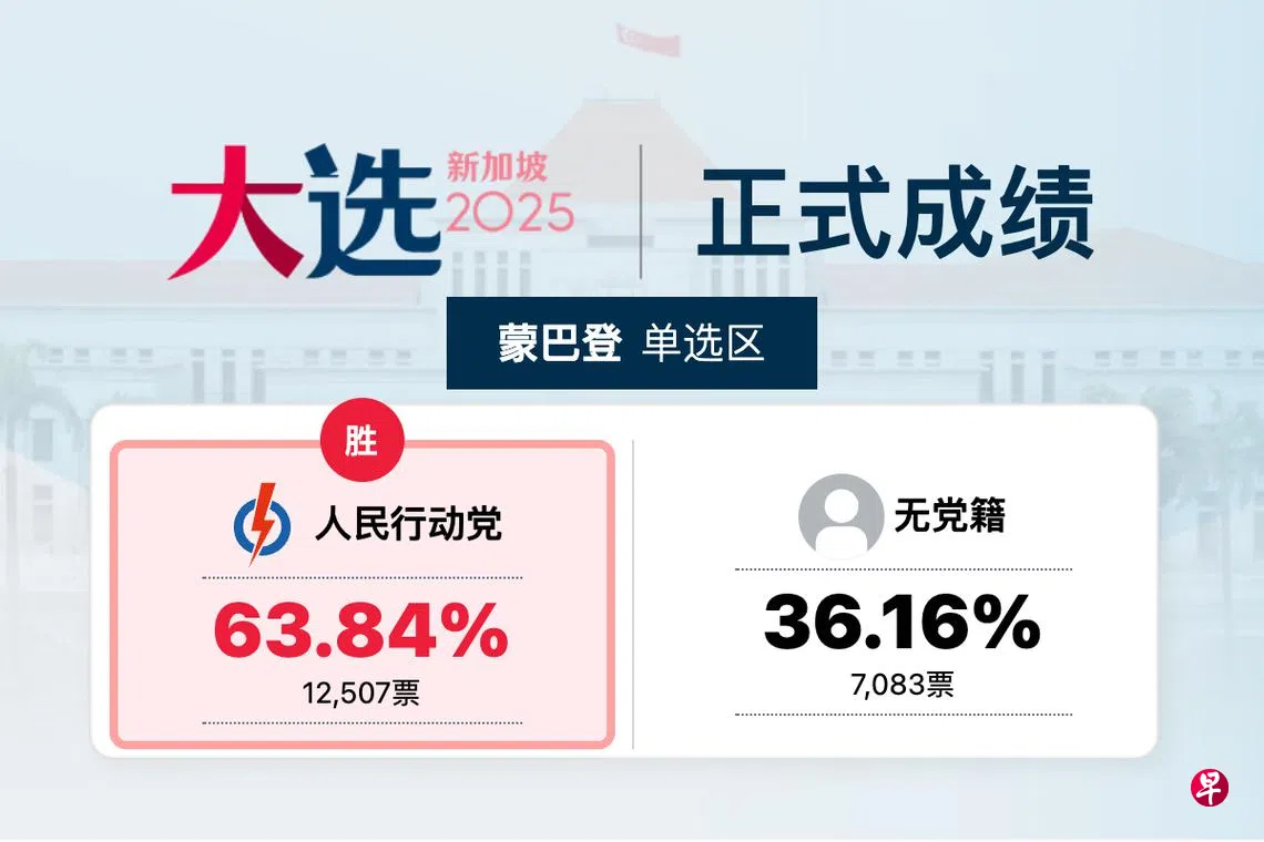 【GE2025正式成绩】蒙巴登区 行动党胜出人民行动党蒙巴登区候选人吴诗琪(Gho Sze Kee)以63.84%对36.16%,击败无党籍候选人陈伟洋(Jeremy Tan),成功为行动党守土。 2025年新加坡大选投票日投票人民行动党上一篇【正式成绩】白沙—樟宜集选区 行动党胜出下一篇刘宇扬: 虽败选但将依旧走访 盼五年后再参选购买此文章