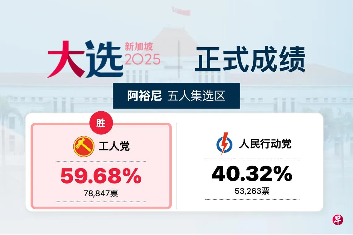 工人党阿裕尼集选区候选人毕丹星、林瑞莲、严燕松、莫哈默法理(Muhammad Fadli Bin Mohammed Fawzi)和张文杰(Kenneth Tiong),以59.68%对40.32%,击败人民行动党的陈惠意,飞翔(Faisal Abdul Aziz)、洪子扬(Adrian Ang)、杰格(Jagathishwaran Rajo)和刘克元(Daniel Liu),成功守住阿裕尼议席。