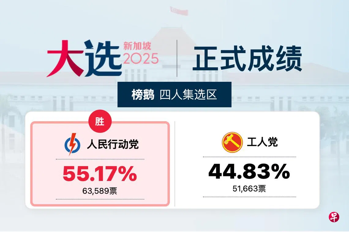 【GE2025正式成绩】行动党夺下榜鹅集选区人民行动党榜鹅集选区候选人颜金勇、普杰立、孙雪玲和杨涴淩,以55.17%对44.83%,击败工人党候选人贺沛星(Harpreet Singh)、滕沛源(Alexis Dang)、艾莉雅(Alia Mattar)和区致铭(Jackson Au)。 2025年新加坡大选投票日投票人民行动党工人党上一篇黄总理:感谢马西岭—油池选民给予强有力的委托下一篇【GE2025】两集选区料失利 国民团结党可能失去按柜金购买此文章