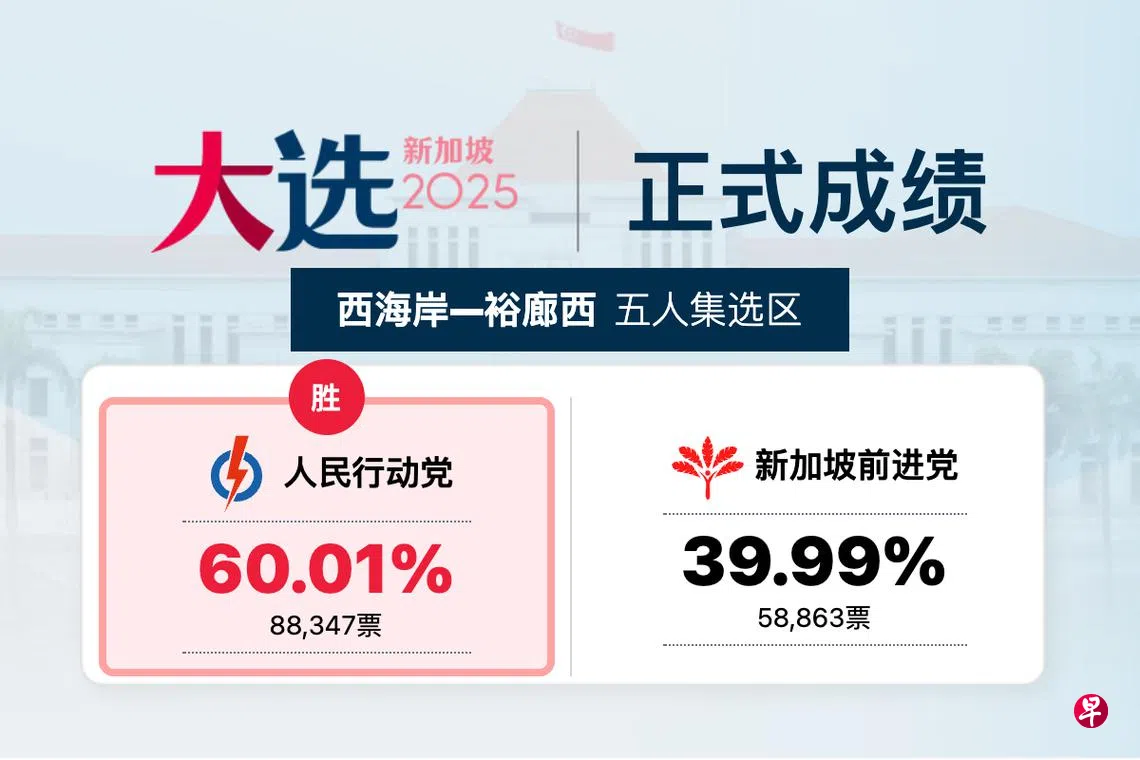人民行动党西海岸—裕廊西集选区候选人李智陞、洪维能、黄伟中、贺明(Hamid Razak)和吕思憓(Cassandra Lee),以60.01%对39.99%,击败新加坡前进党的陈清木医生、梁文辉、潘群勤、乐吉(Sumarleki Amjah)和萨尼(Sani Ismail),赢得这区议席。