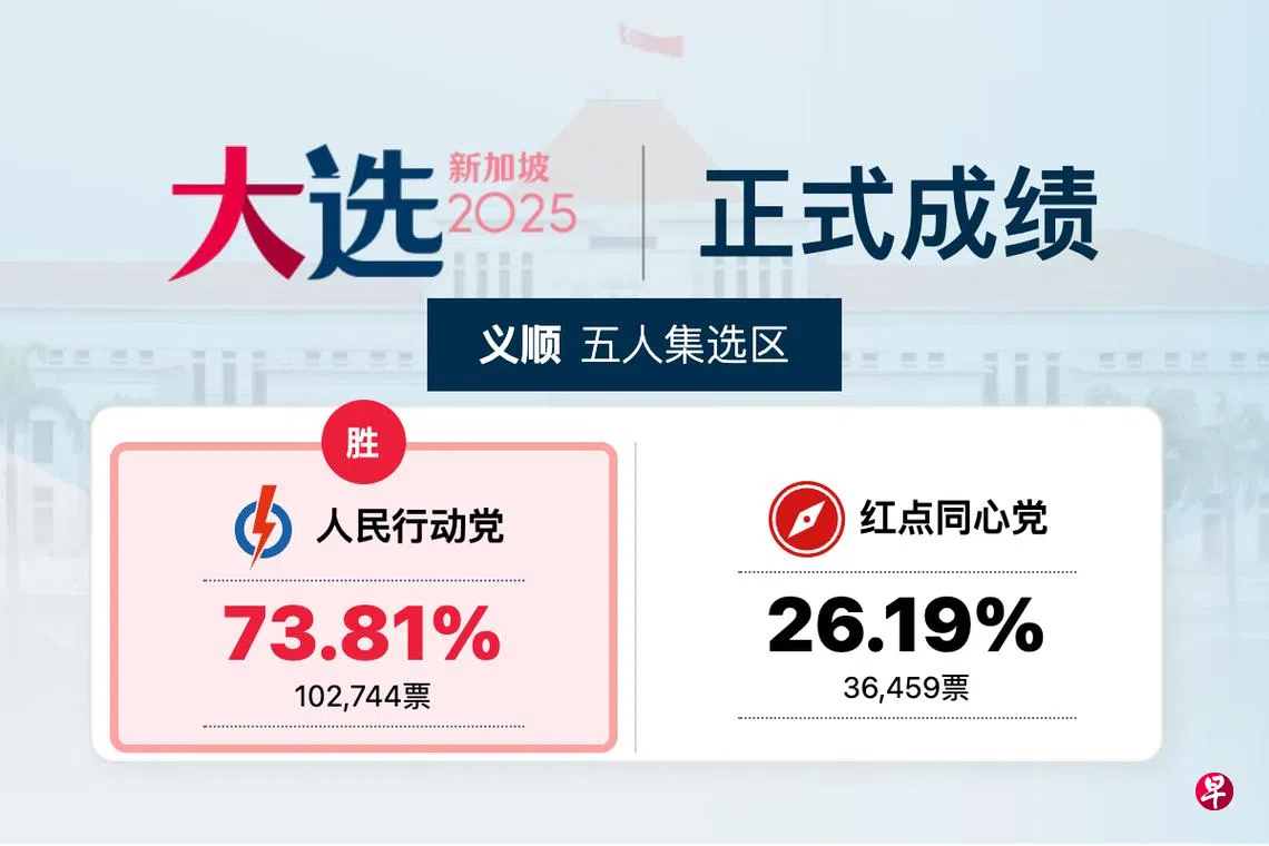 人民行动党义顺集选区候选人尚穆根、赛义德哈伦(Syed Harun Alhabsyi)、吴函燕(Goh Hanyan)、林纬量(Jackson Lam)及李蕙莹(Lee Hui Ying),以73.81%对26.19%,击败红点同心党的拉维、符明俊、冯行全(Pang Heng Chuan)、林怡慧(Sharon Lin)及奥威(Syed Alwi Ahmad)。
