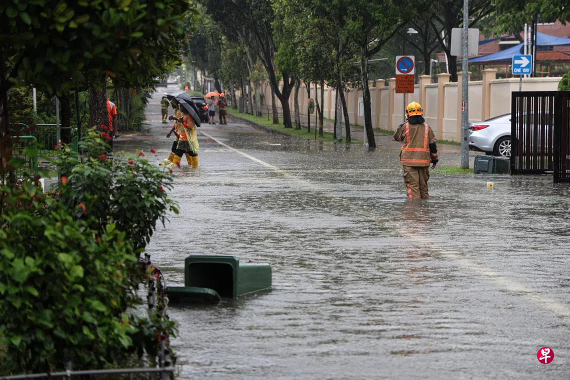 受强降雨影响,武勒登通道和京士路一带星期一(5月5日)下午2时许,出现突发性淹水,淹水持续了大约20分钟。