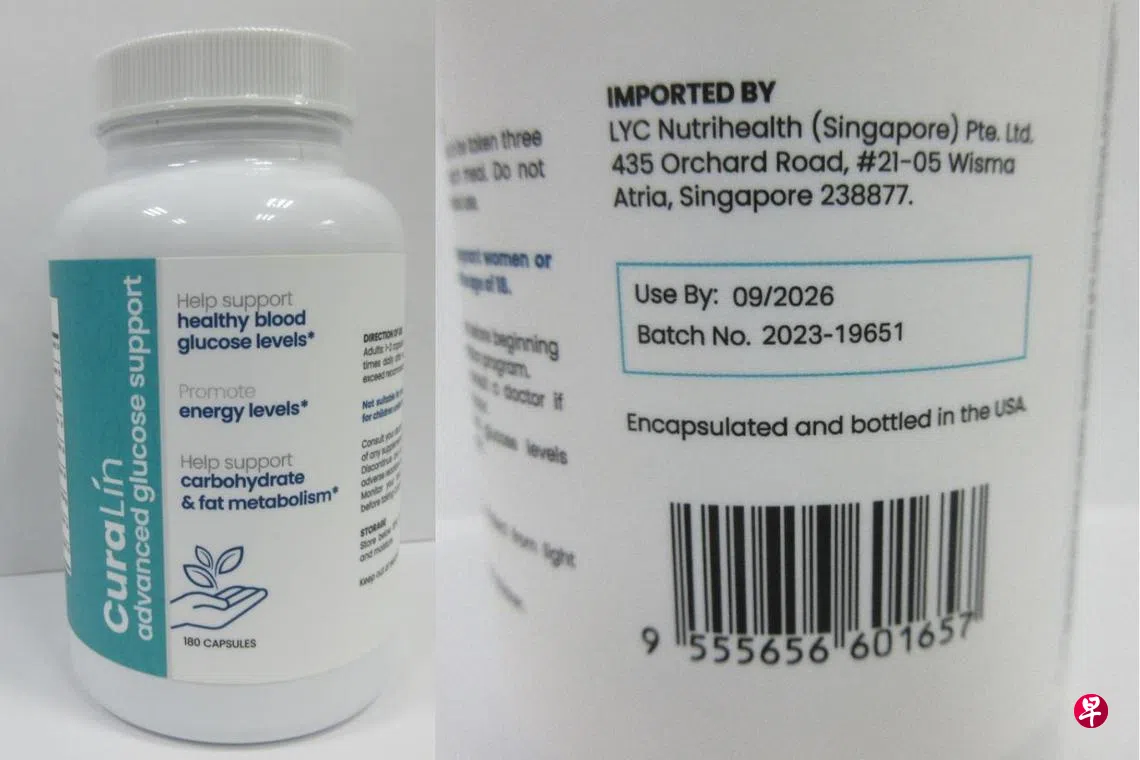 卫科局星期一(5月5日)发文告说,新加坡LYC Nutrihealth有限公司从美国进口的两批次CuraLin品牌的血糖保健品(CuraLin advanced glucose support)被发现含有未经申报的处方成分格列本脲(glibenclamide)和二甲双胍(metformin)。
