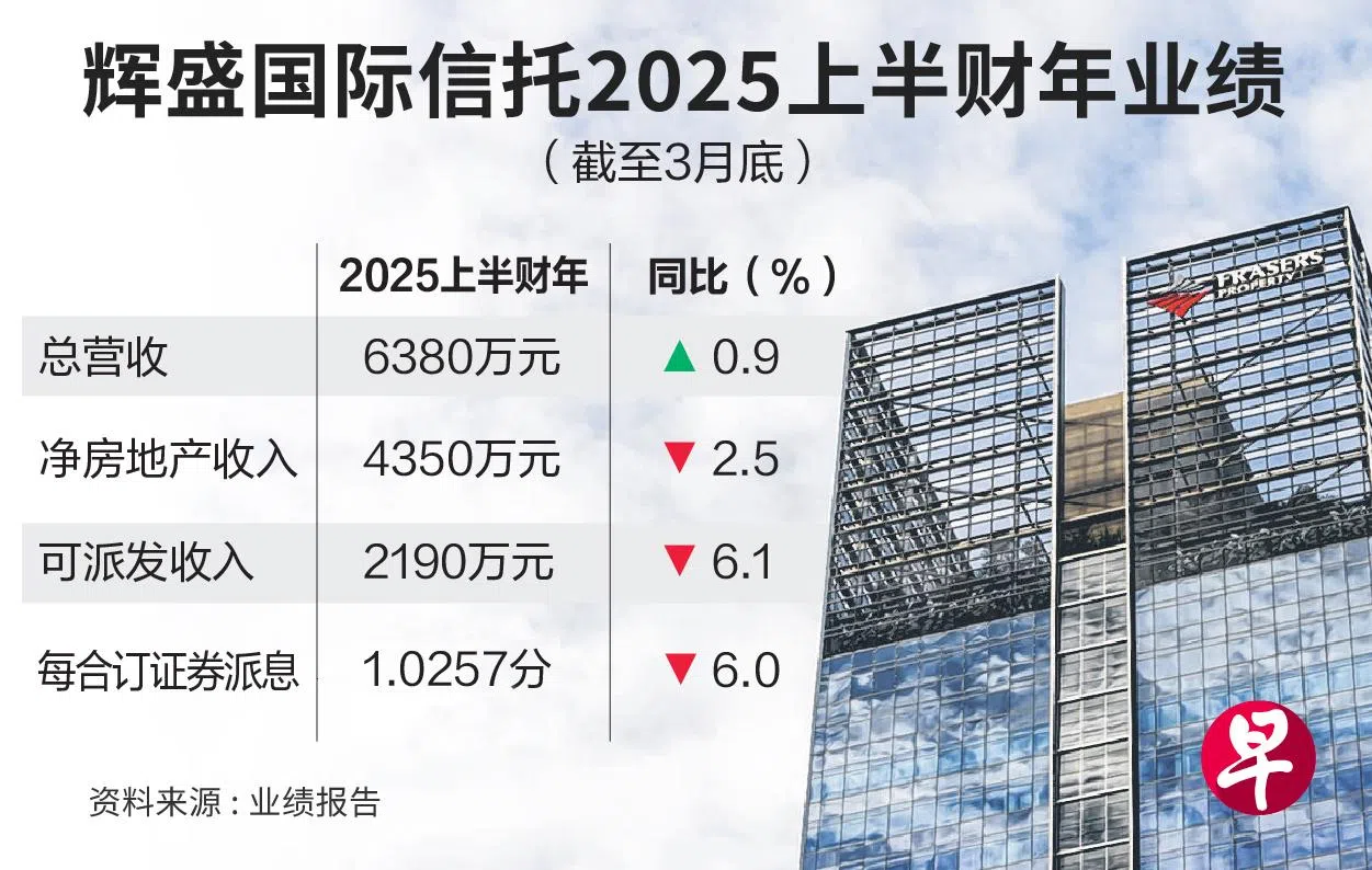 辉盛国际信托星期二(5月6日)开市前发布截至3月底的2025上半财年业绩显示,信托每合订证券派息(distribution per stapled security,简称DPS)同比减少6.0%至1.0257分。