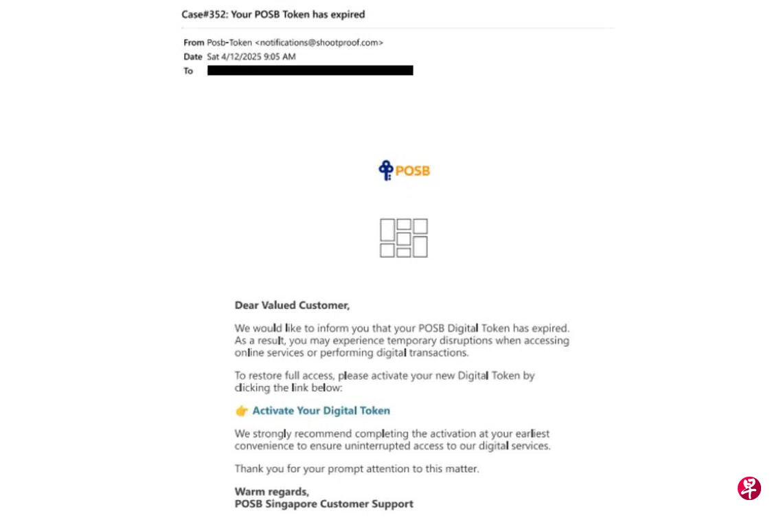 新加坡警察部队星期二(5月6日)发文告说,在这类骗案中,受害者会收到据称来自新加坡邮政储蓄银行(POSB)的电邮,声称手机银行网络密码器(digital token)已过期,诱导受害者点击链接重启或更新。