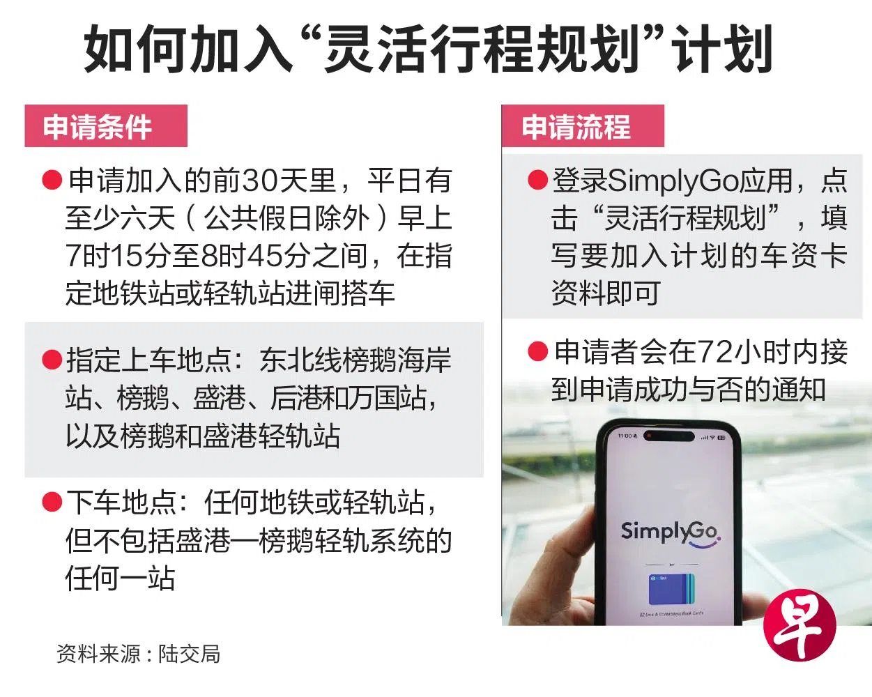 成功通过SimplyGo应用注册后,只要工作日早上7时15分之前,或8时45分至9时45分之间,在上述地铁站或轻轨站进闸,而且不在盛港与榜鹅轻轨站出闸,就能累计相等于40%至80%车资的积分,以兑换回扣到交通卡上。