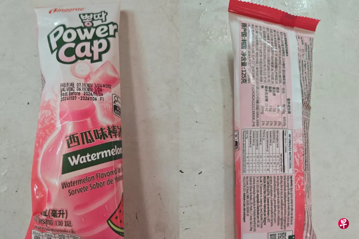 食品局星期五(5月16日)发文告说,被召回的冰棒为130毫升装的Binggrae Power Cap Watermelon Flavoured Ice Tube,生产批号20241107–20261106,最佳食用日期为2026年11月6日之前。