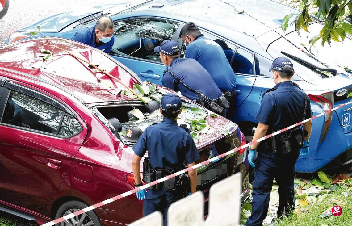 男子从组屋高楼坠下,撞坏窗户、砸断树枝,连人带枝干,压坏停车场的德士和轿车。