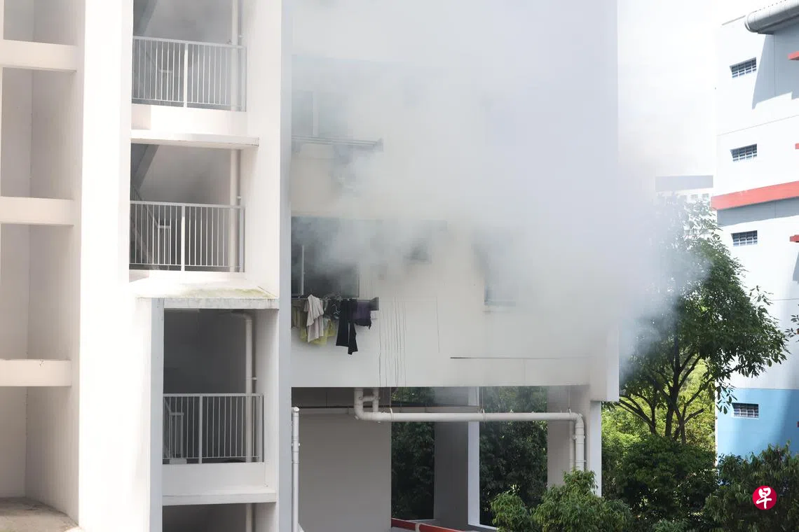 金文泰1道一组屋单位发生火患,屋主夫妇接到通知后赶回家了解情况。