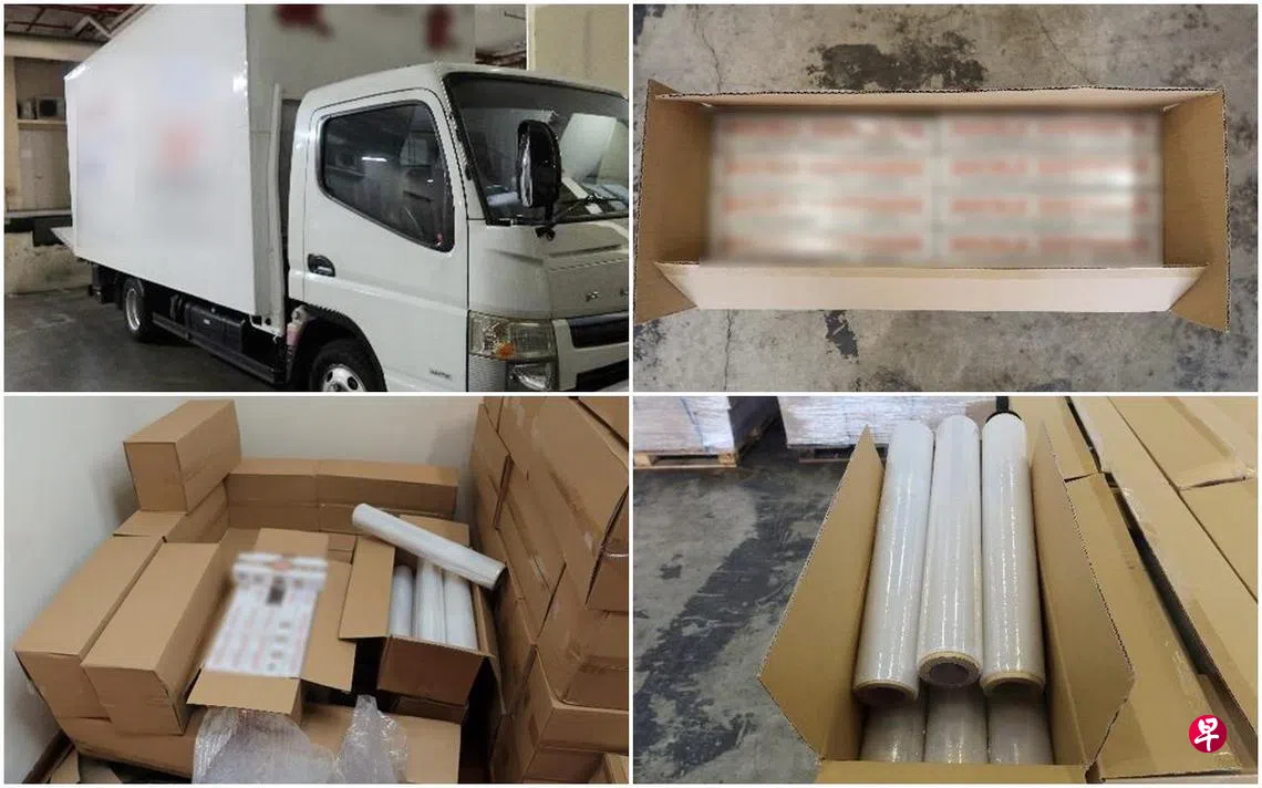 5月9日,关税局执法人员在武吉巴督弯一座工业大楼内,发现一名男子正推着装满褐色纸箱的手推车,缓缓走向停放的货车,另有两名男子正在把其他纸箱搬入货车。