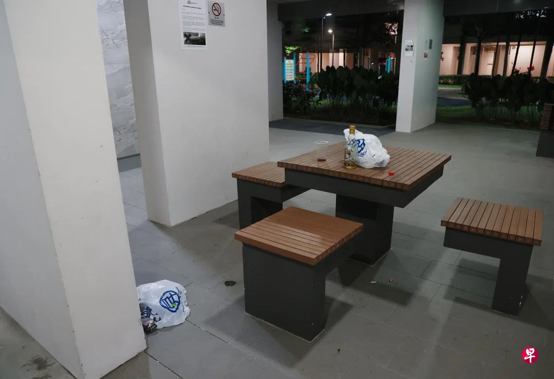 武吉巴督西组屋楼下的公共桌椅处常有人聚集喝酒和聊天,居民申诉噪音扰民、垃圾成堆。