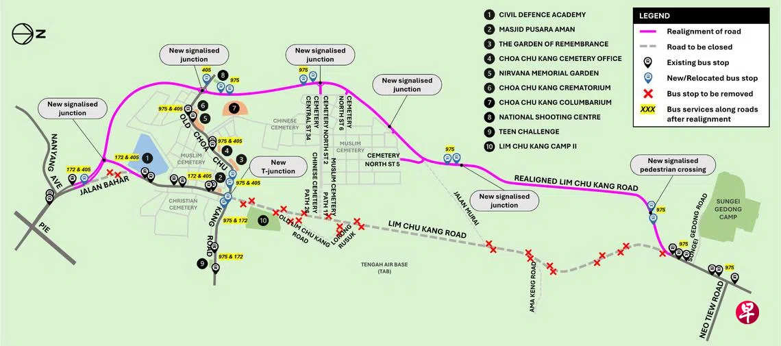 受影响的巴士路线包括172号、405号和975号,其中975号将改道行驶新路段。在节庆期间服务的405号将绕过关闭的林厝港路;172号和405号继续途径惹兰巴哈,但不会在两个被移除的车站停靠。