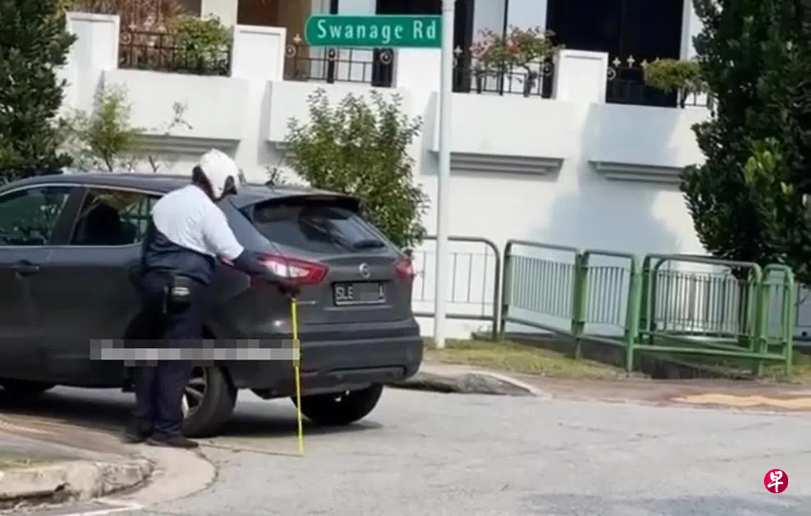 一名公众日前在士温纳路(Swanage Road)的私宅区目睹稽查员向一辆银色汽车开罚单时使用量尺测量车身到路口的距离,将这一幕拍下分享至社媒。