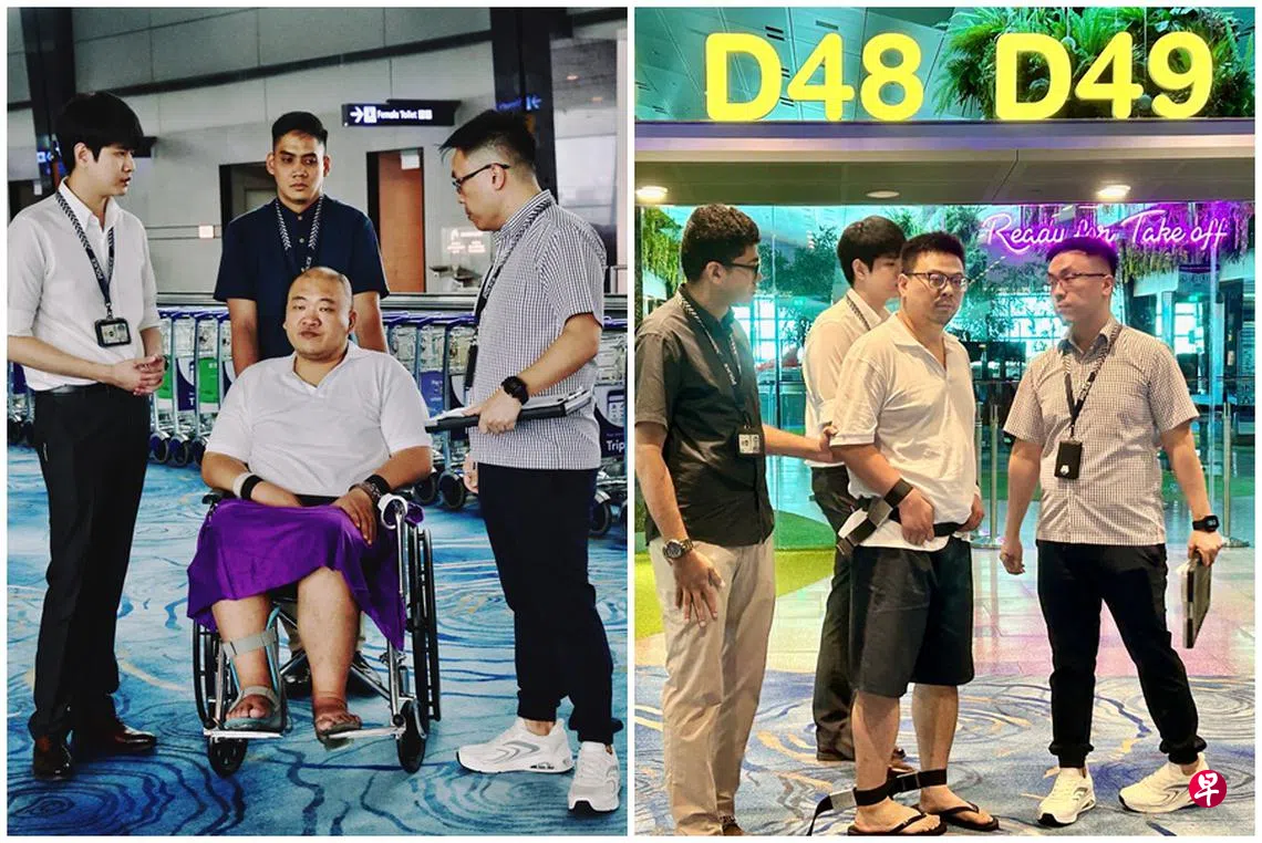两名中国籍男子涉嫌在吉隆坡飞往新加坡的班机上互相接应偷乘客行李,星期四(6月5日)早上被押到樟宜机场重组案情。