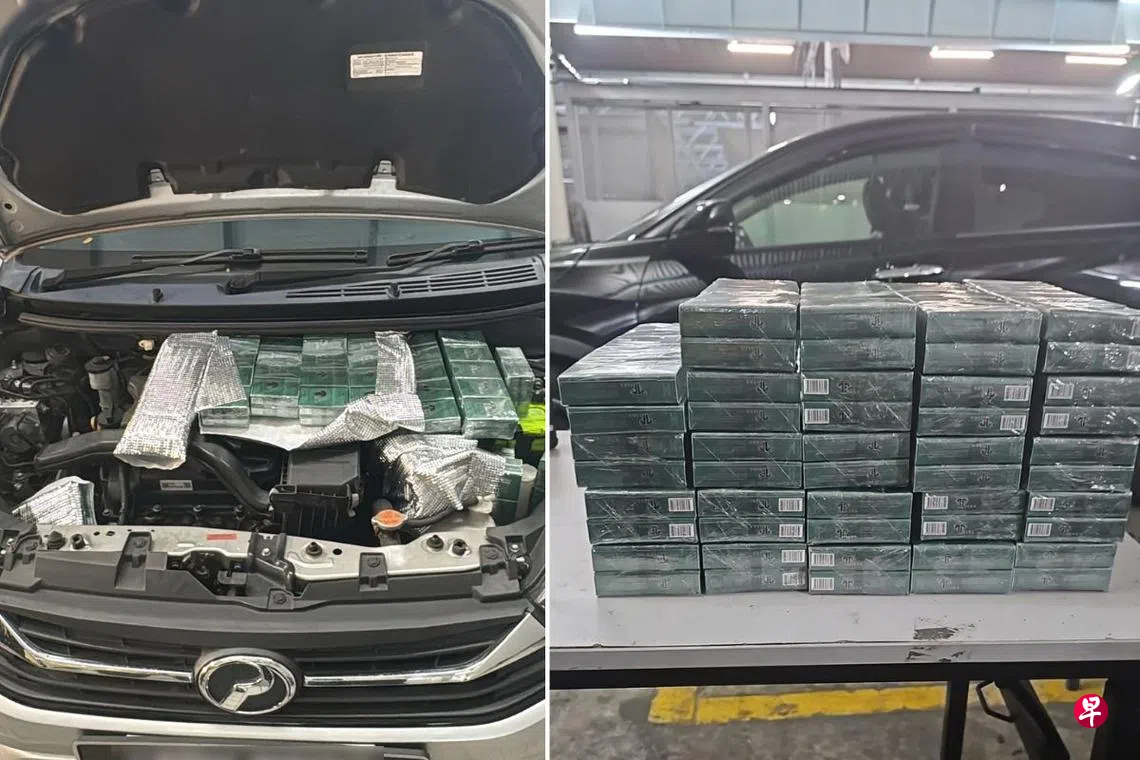 将漏税香烟藏在引擎盖下企图走私进入我国,移民与关卡局识破不法分子企图,起获超过20条漏税香烟。