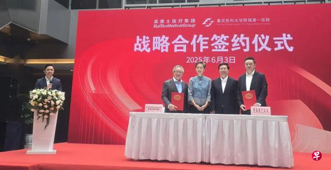 新交所主板挂牌公司莱佛士医疗集团星期二(6月10日)发布消息时说,新加坡数码发展及新闻部长杨莉明,以及重庆市长胡衡华,6月3日出席了这个签约仪式。莱佛士医疗集团执行主席吕俊旸医生和重庆医科大学附属第一医院党委书记吴昊,代表双方签署合约。
